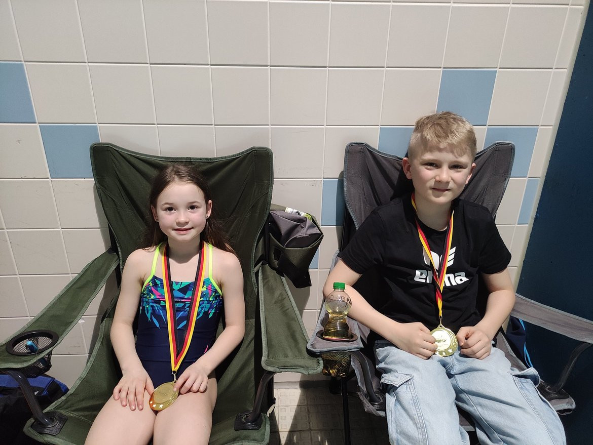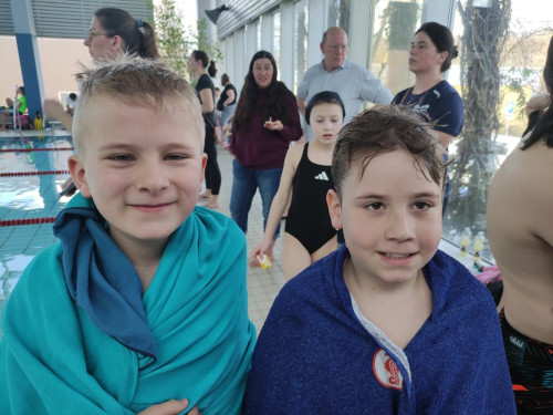 Einen vereinsinternen Zweikampf gab es in der AK 10 männlich: Ben Engelhardt und Johann Schellenberger schwammen gegeneinander. Nach 50m Hindernis, 50m kombinierter Übung und 50m Flossenschwimmen lag Ben mit Rang 1 knapp vor Johann auf Platz 2.